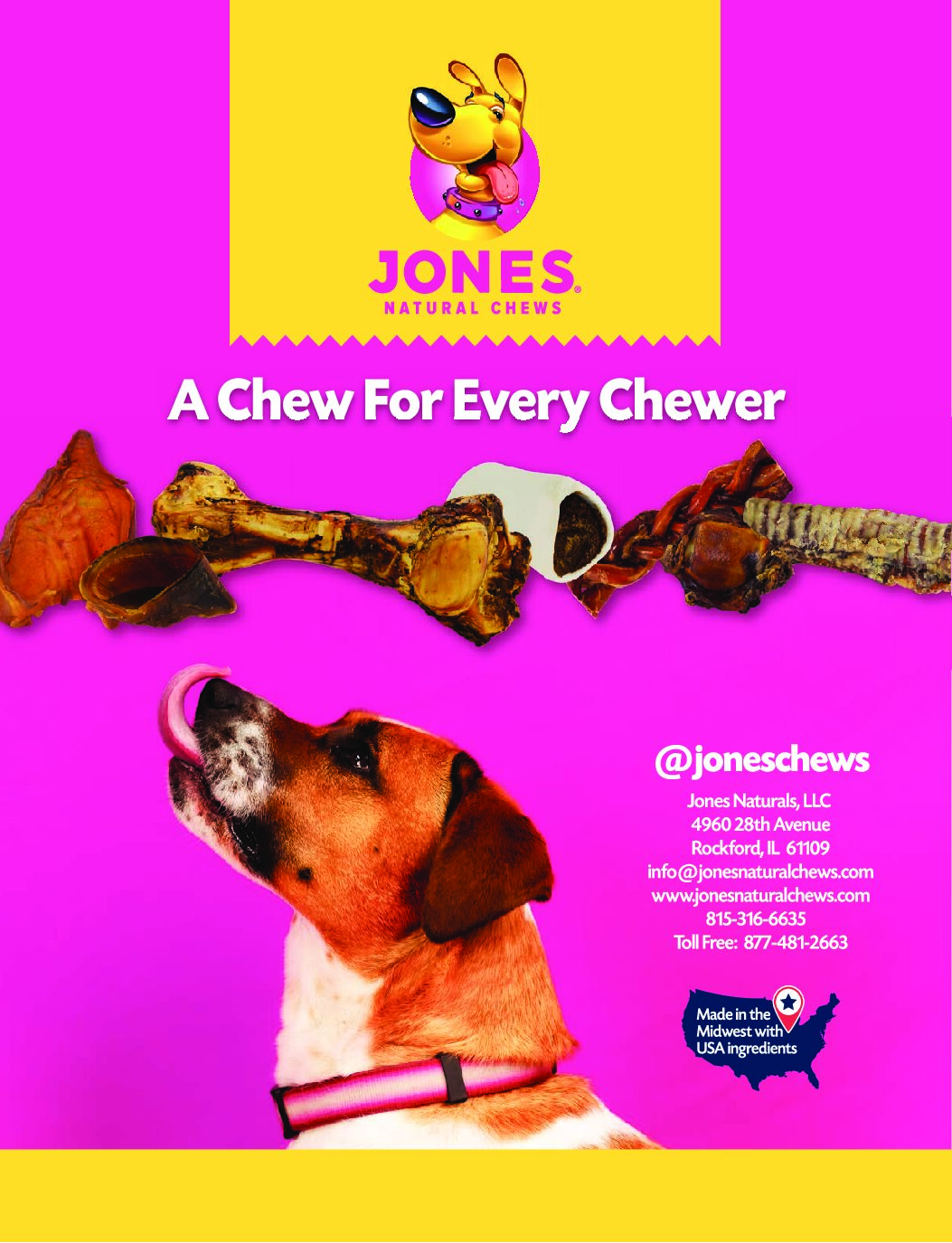 Jones Natural Chews is leading the category thanks to its highest quality, USA-raised, sourced and manufactured natural dog treats and chews. Dogs get long-lasting and healthy-tasting enjoyment. Owners get to feel good about the chewing experience they provide.